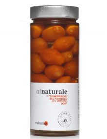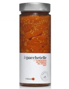 Die Einzigartigkeit der an den Hängen des Vesuvs angebauten Kirschtomate, halbiert in zwei Teile („Pacchetelle“) und ohne Zusätze, im Glas gelagert: Weder Wasser, noch Salz – nur die reine Tomate, um sie so in ihrem ganz natürlichen Wert genießen zu können.