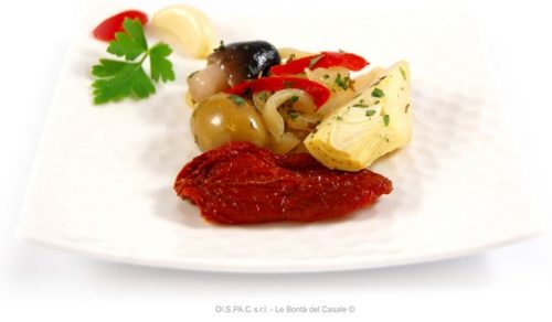 ZUTATEN: Auberginen, Moospilze (Volvaria Volvacea), Oliven, Artischocken, Paprika, dehydrierte, getrocknete Tomaten (in veränderlichen Gewichtsanteilen) 60%, Sonnenblumenöl, Weinessig, Salz, Kräuter, Gewürze. Säureregulator: Zitronensäure.