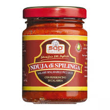 Diese Spezialität aus Kalabrien ist aus rohem, gut durchwachsenem Schweinefleisch und -speck das zusammen mit scharfen, frischen Chilischoten durch den Wolf gedreht wird. Dann wird die Masse kurz geräuchert, 1 Monat luftgetrocknet und anschließend ins Glas gefüllt. Sie ist ein spannendes Würzmittel für die Küche wie auf Pizza, Bruschetta, zur Pasta oder in Saucen.