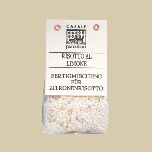 Zutaten: Carnaroli Reis 96% aus Italien, Zitronenabrieb 2%, Schnittlauch, Petersilie, Zwiebeln.